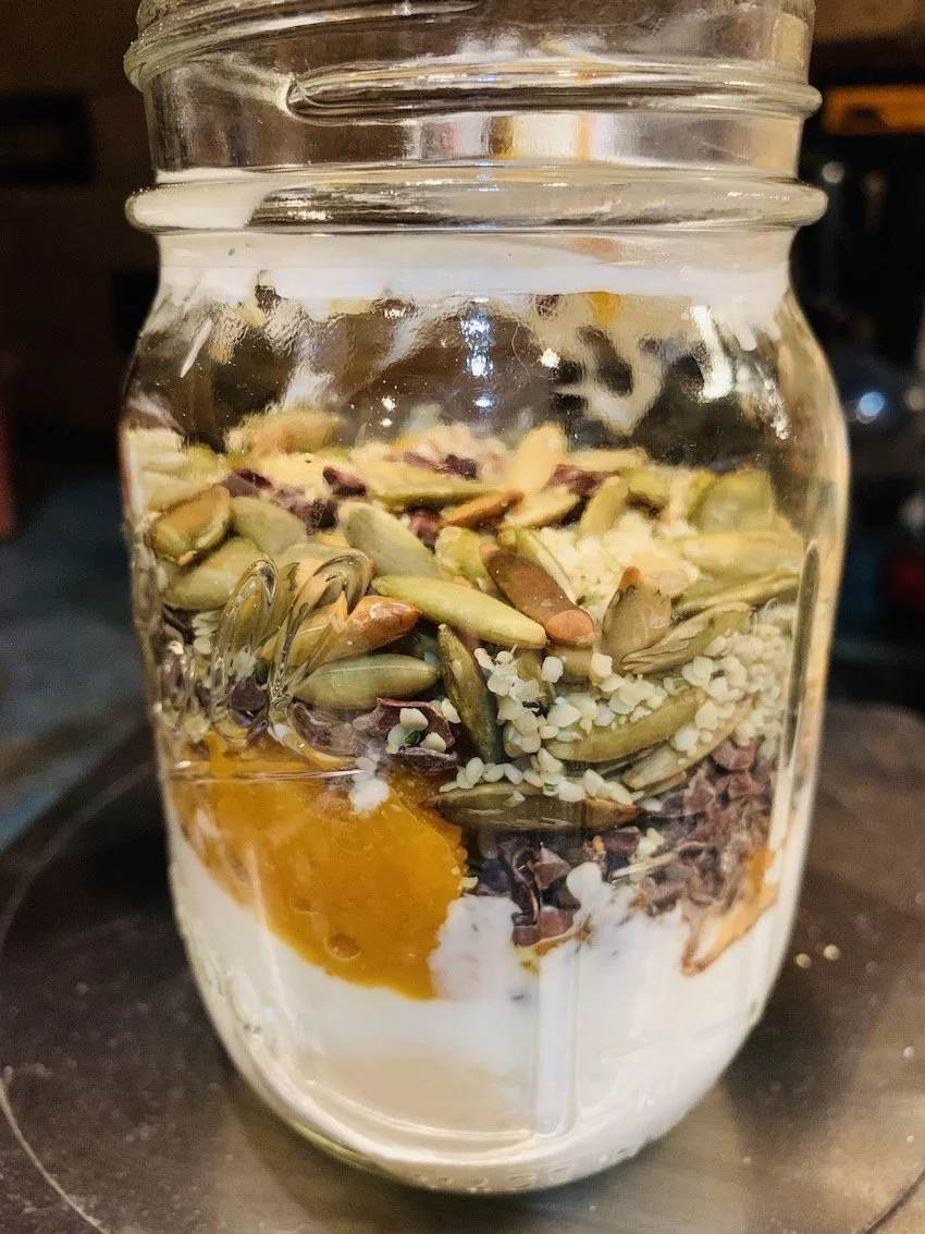 I loved this creation and especially enjoyed the toasted seeds, the blend of pumpkin and yogurt, and well… I love breakfasts out of the jar!